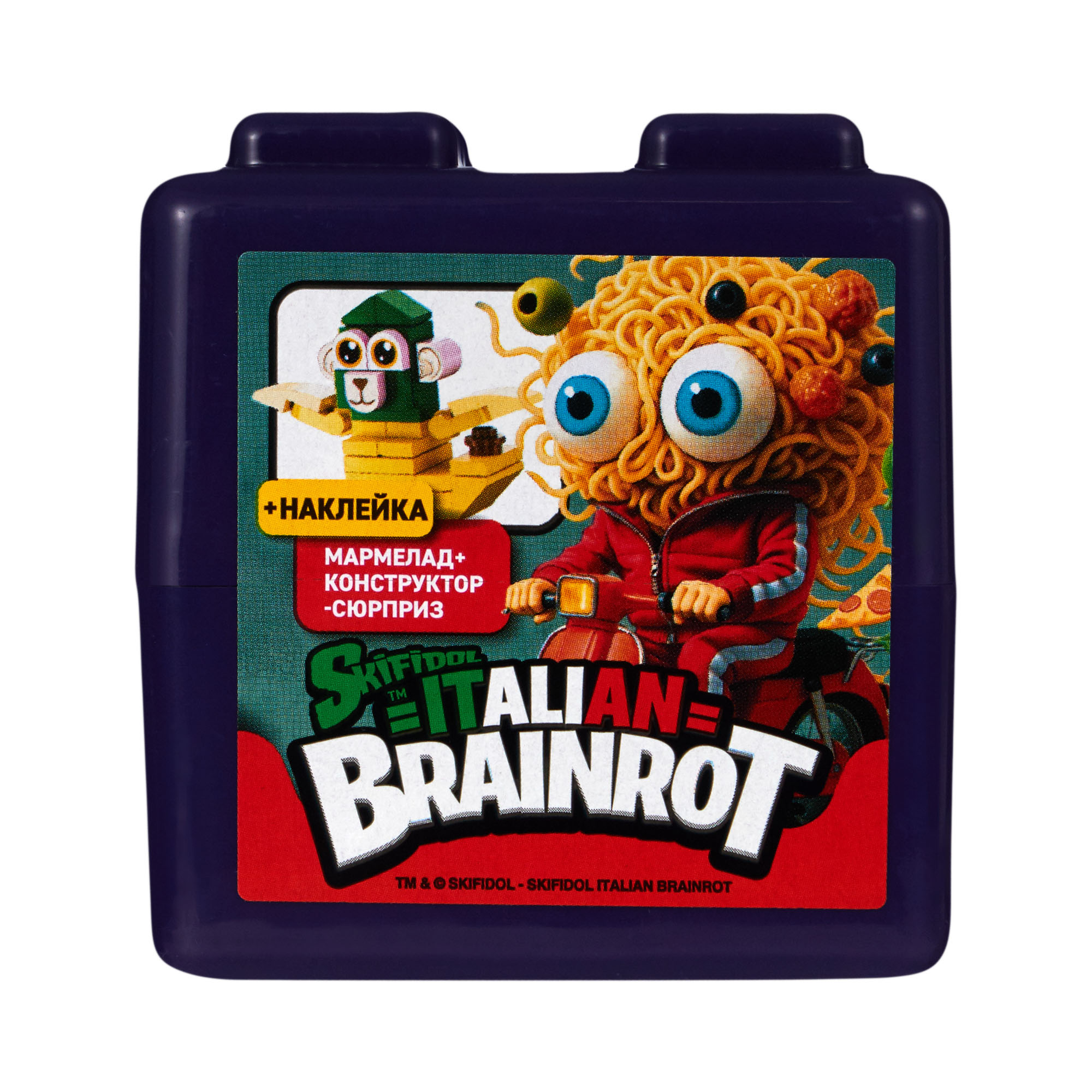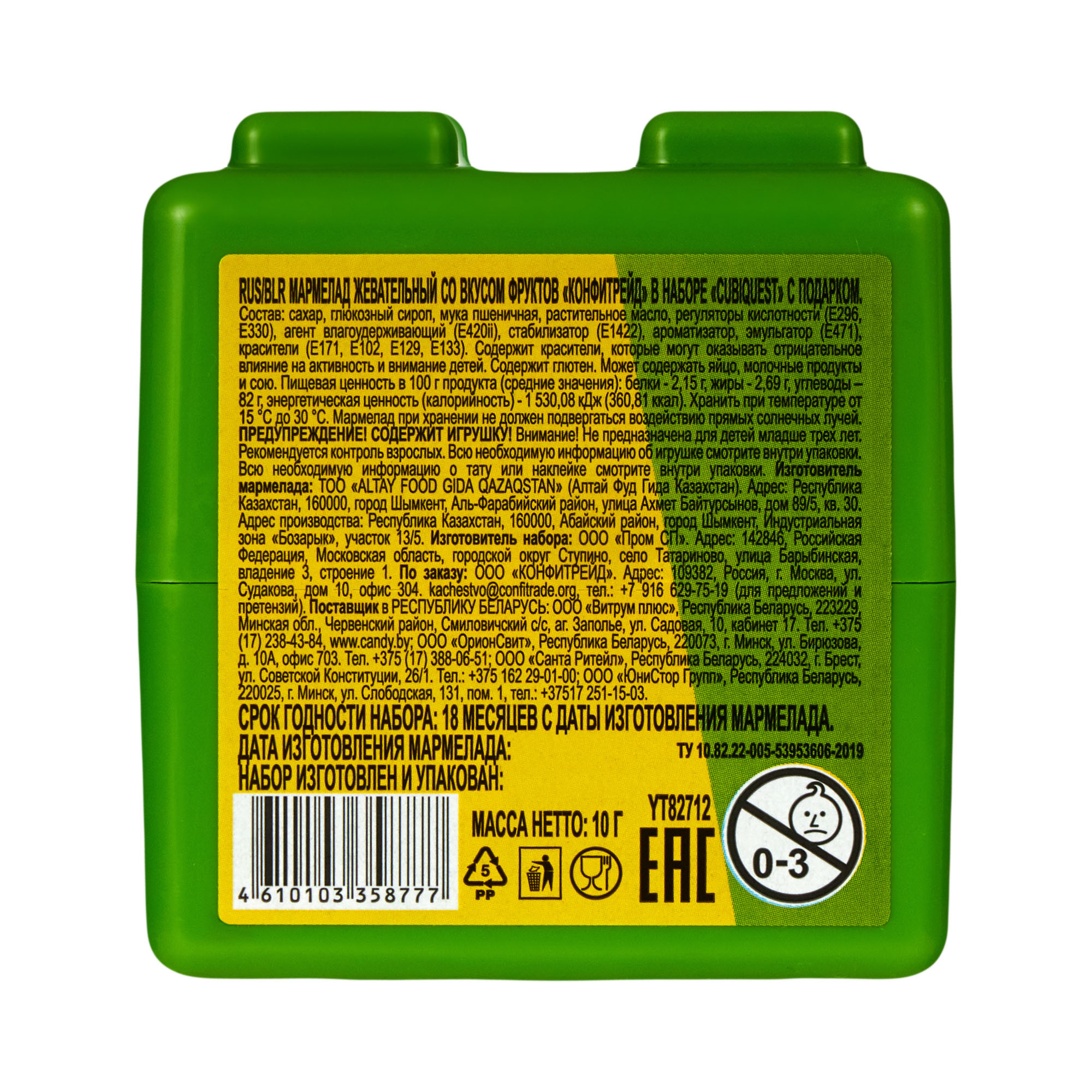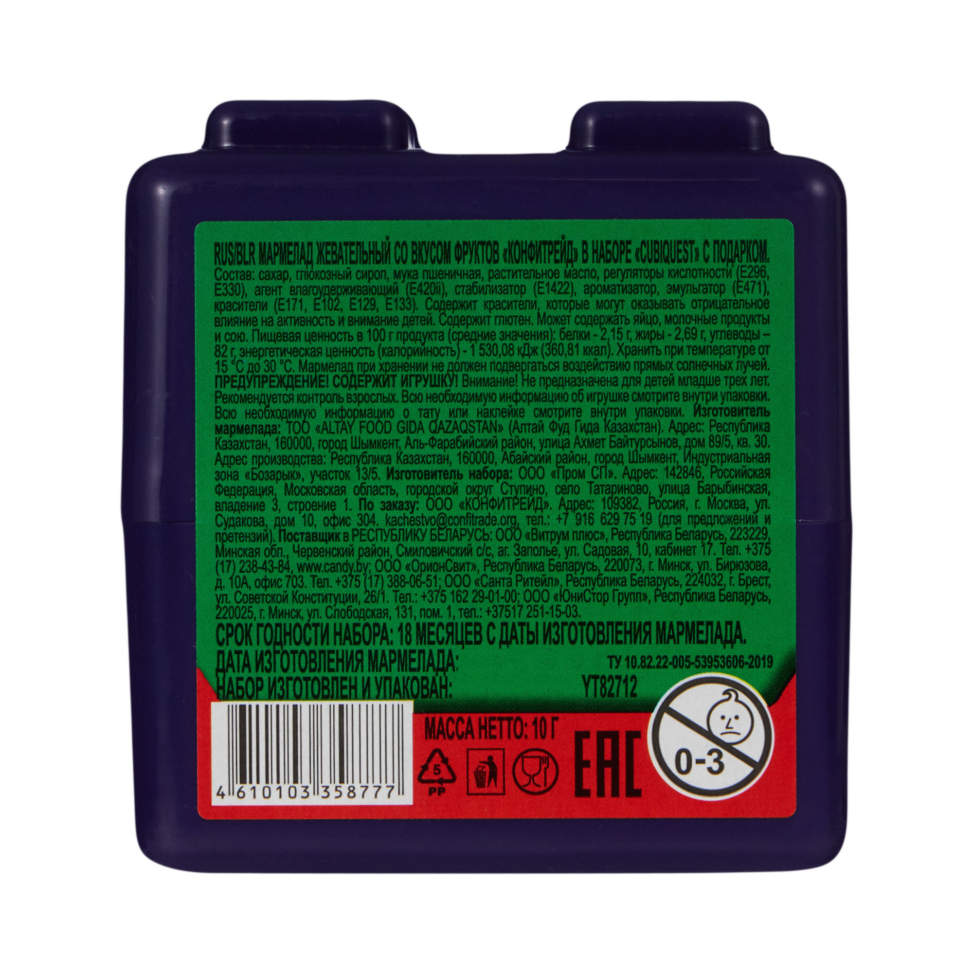 сахар, глюкозный сироп, мука пшеничная, растительное масло, регуляторы кислотности (E296, E330), агент влагоудерживающий (Е420ii), стабилизатор (Е1422), ароматизатор, эмульгатор (E471), красители (E171, E102, E129, E133).
