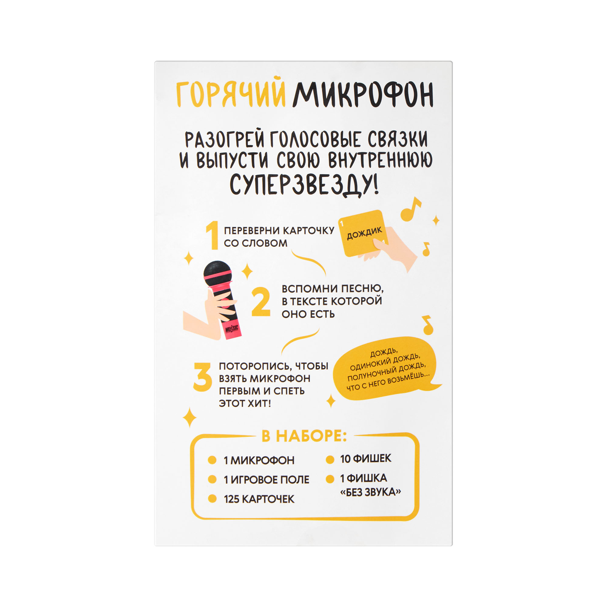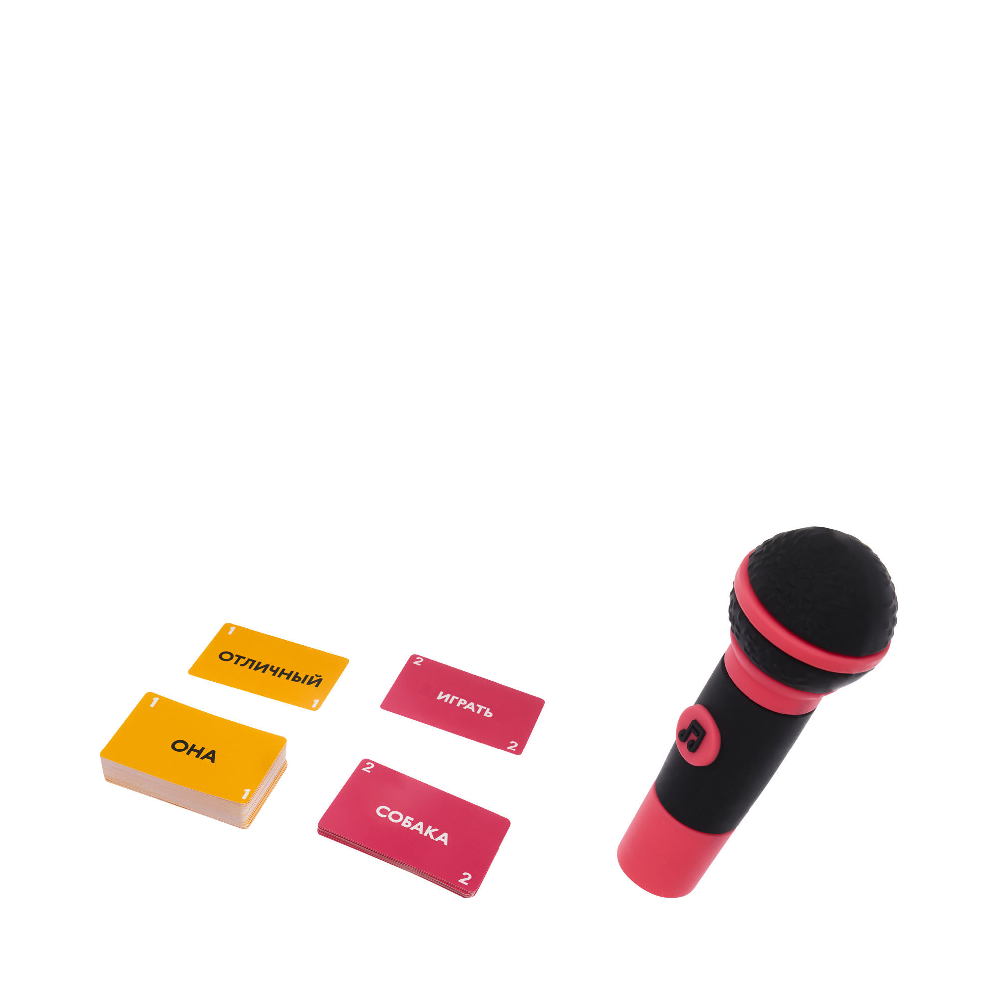 микрофон: 98% АБС-пластик, 2% железо; карточки, игровое поле, фишки: 100% бумага