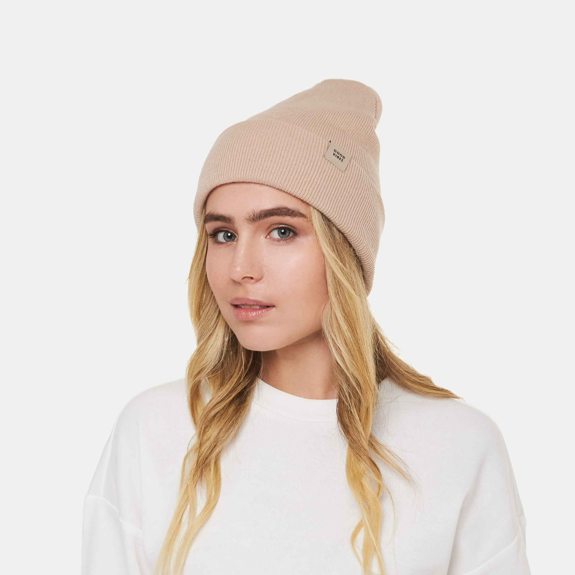 Размер модели универсален, он адаптируется под вашу голову, обеспечивая стопроцентный комфорт. Шапку можно носить с плащом, пуховиком, пальто, ветровкой, спортивным костюмом — с чем угодно. Оригинальная нашивка «Good vibes» на отвороте — это талисман хорошего настроения. Симпатичный бежевый цвет — находка для экспериментов с палитрой вашего гардероба!