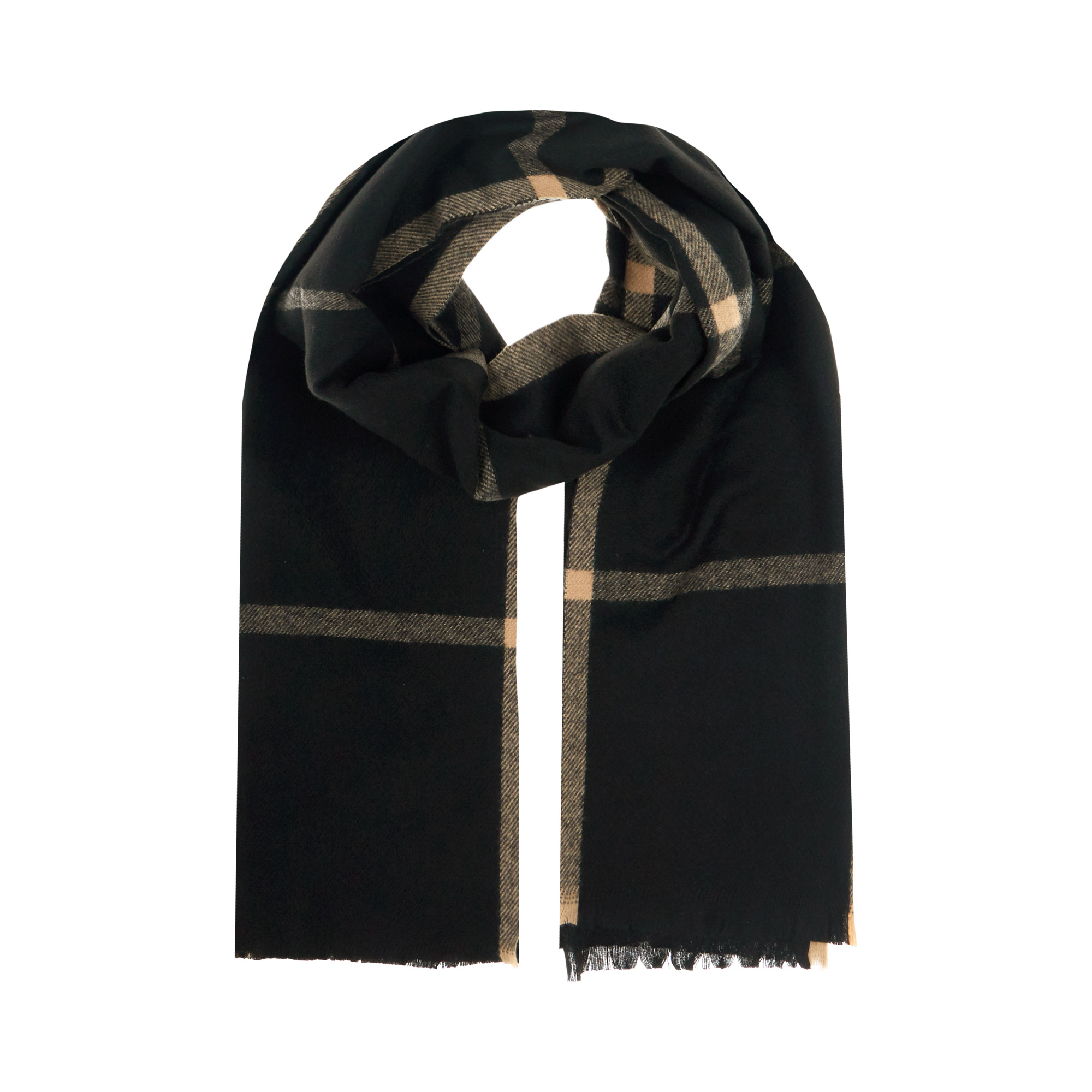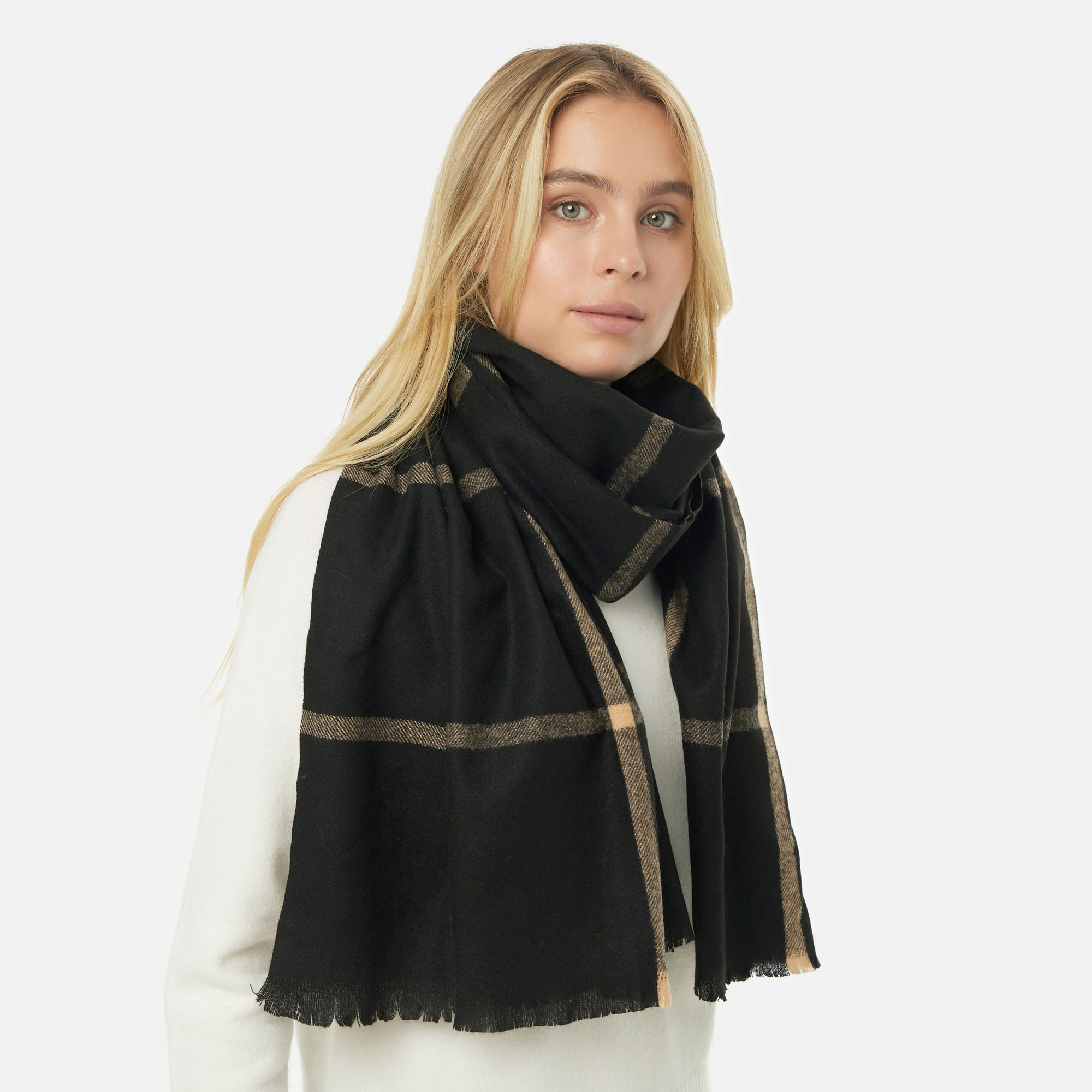 Роскошный тёплый шарф насыщенно чёрного цвета, изящно дополненный бежевой клеткой. Он подходит как для мужчин, так и для женщин. Аксессуар выглядит эффектно. Выразительный контраст оттенков изделия, вызывает восторг. Внушительный размер открывает простор для фантазии: создайте объёмный воротник, выберите классическое обёртывание или просто накиньте на плечи. Универсальный шарф можно носить с деловым костюмом, пальто, курткой, плащом и даже со спортивным комплектом!