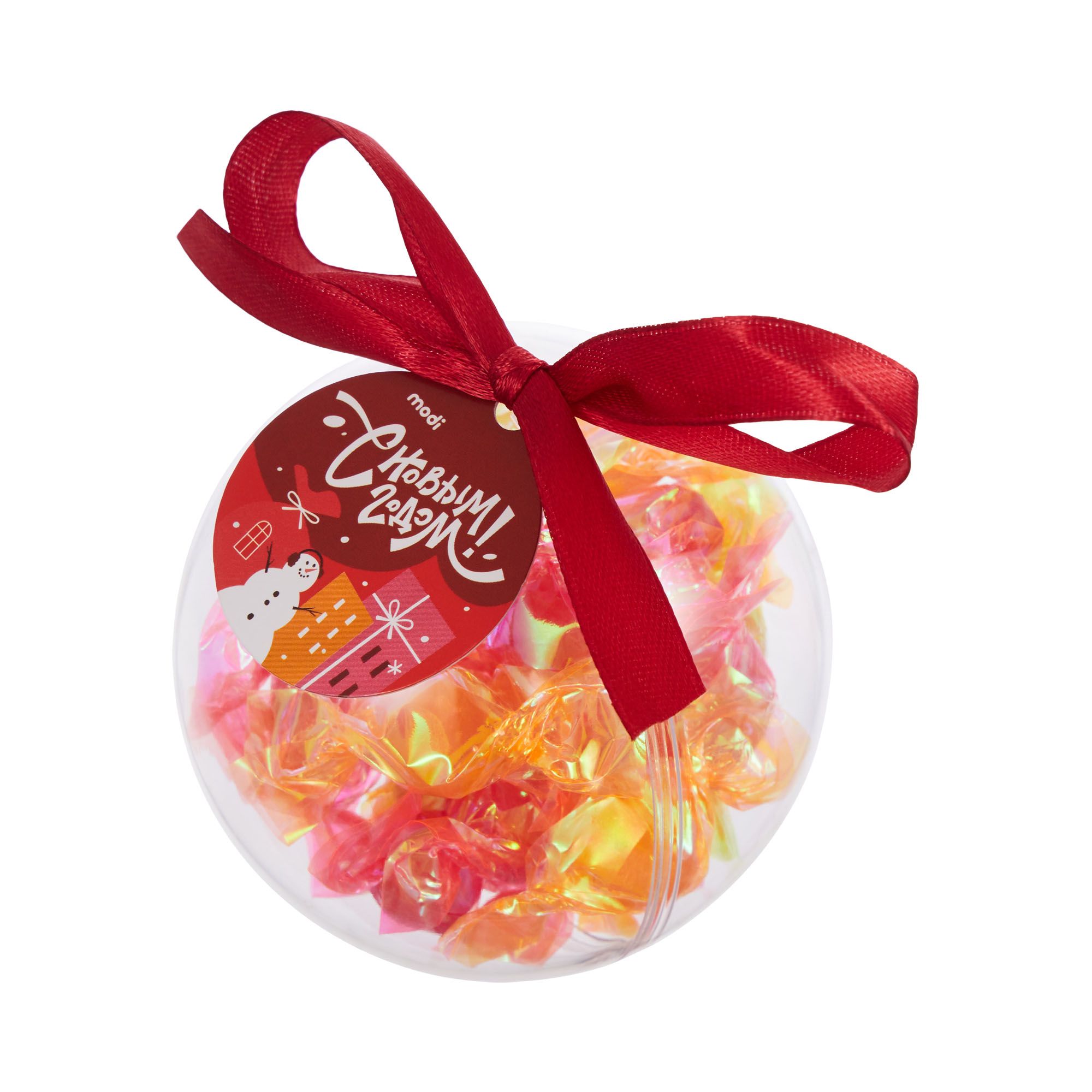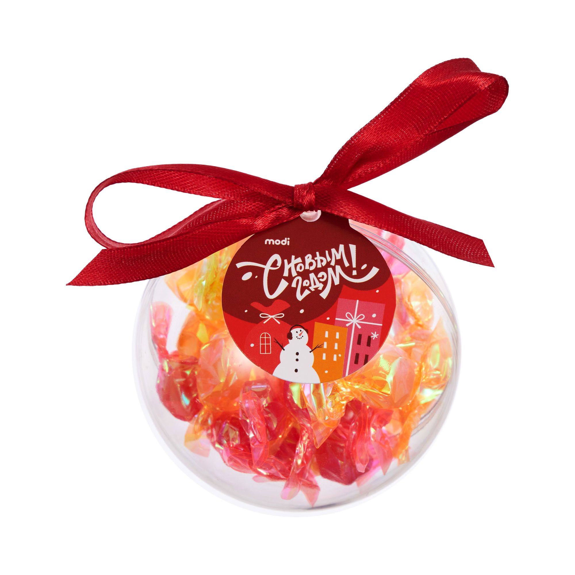 В хрупком стеклянном шаре, будто в новогодней витрине, мерцают разноцветные сладкие сокровища! Каждая конфета играет всеми цветами радуги, создавая внутри шара свой собственный праздничный фейерверк. Роскошный красный бант превращает лакомство в изысканное ёлочное украшение. Спрячьте среди веток как сладкий сюрприз, который можно будет разделить с гостями, сделайте центром праздничной композиции или подарите тем, кто умеет находить красоту в каждой детали. Искусство дарить радость в кристально чистом исполнении!